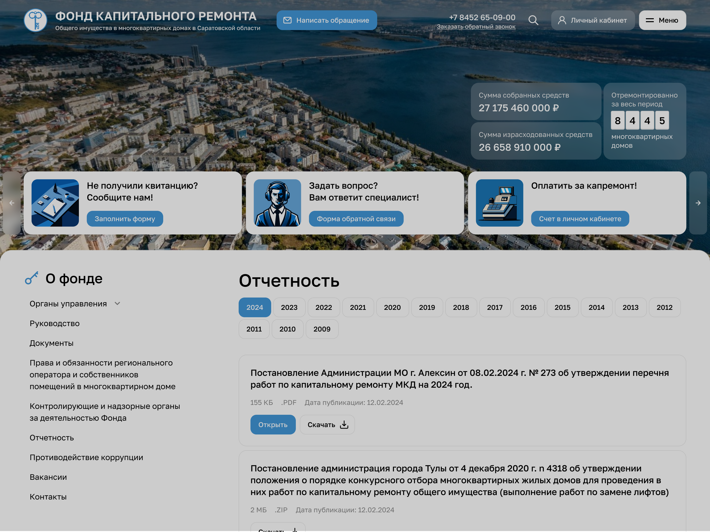 Разработали отдельный разделс отчетностью о проделанной работе,в разделе реализована удобная навигация по годам и районам городаи области