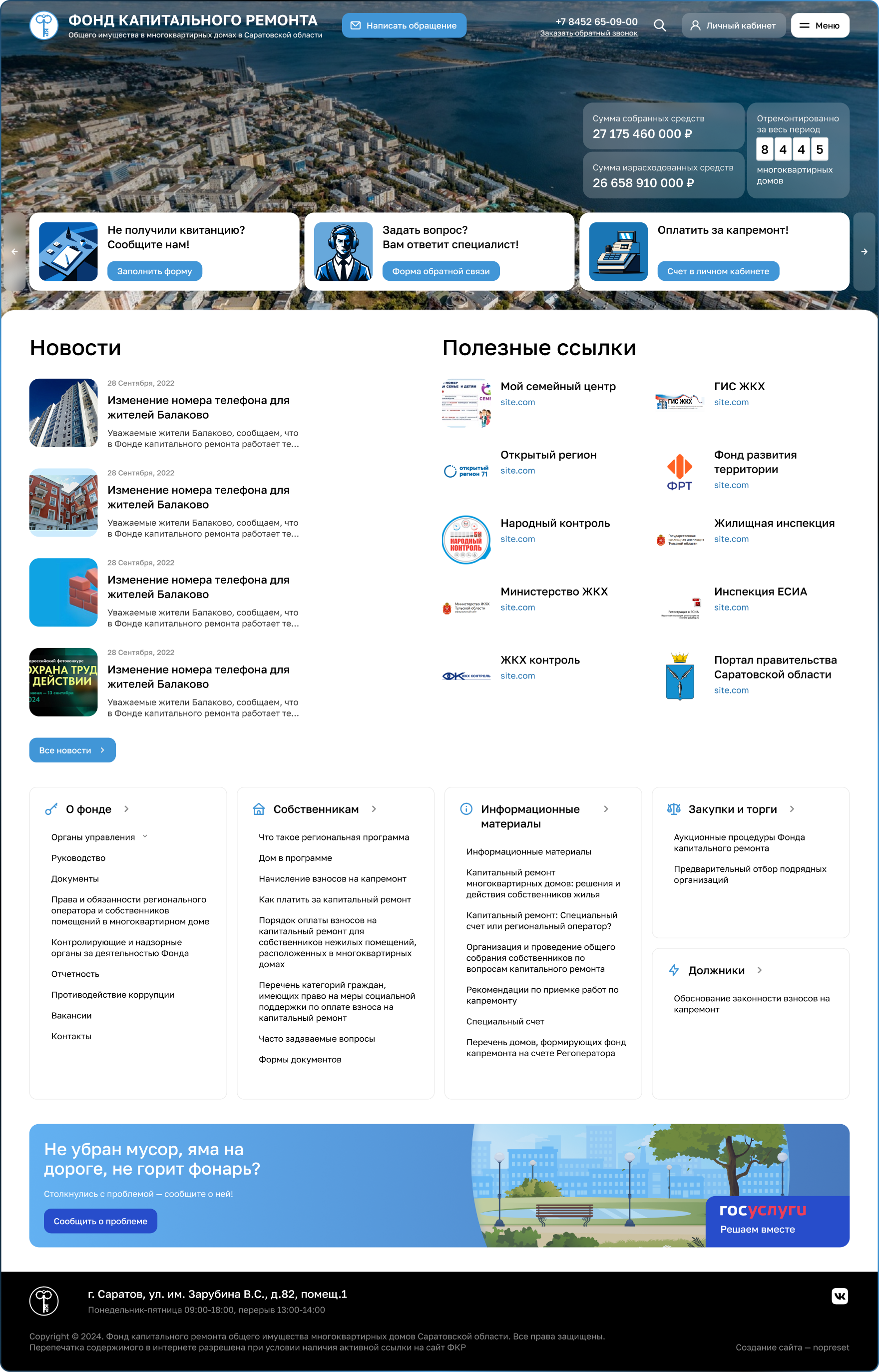 Сайт фонда капитального ремонта Саратовской области создан для сбора обращений от граждан и ответовна их вопросы касаемо работы фонда и приема платежей